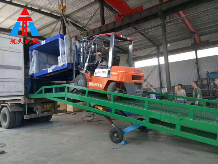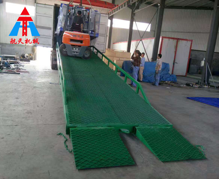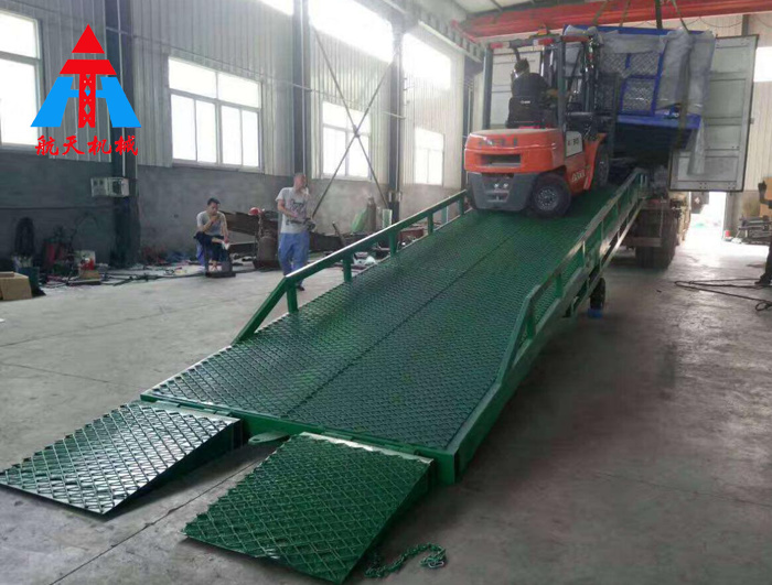 移動液壓登車橋是實現貨物快速裝卸的專用輔助設備,它的高度調節功能使貨車與庫房的貨臺之間架起一座橋梁,叉車等搬運車輛通過它能直接駛入貨車內部進行貨物的批量裝卸,僅需單人作業,即可實現貨物的快速裝卸。移動液壓登車橋使企業減少大量勞力,提高工作效率,獲取好的經濟效益。臺面均設計為網格狀鋼板,這種結構能保證具有很好的強度,又具有防滑功能,還能方便地清掃工作臺面,使它能經常地保持清潔、美觀。移動液壓登車橋無須外接電源,通過手搖泵做動力能輕松地在其整個調整范圍內按50mm的倍數進行高度的調整,可以充分適應各種不同高度的貨車。